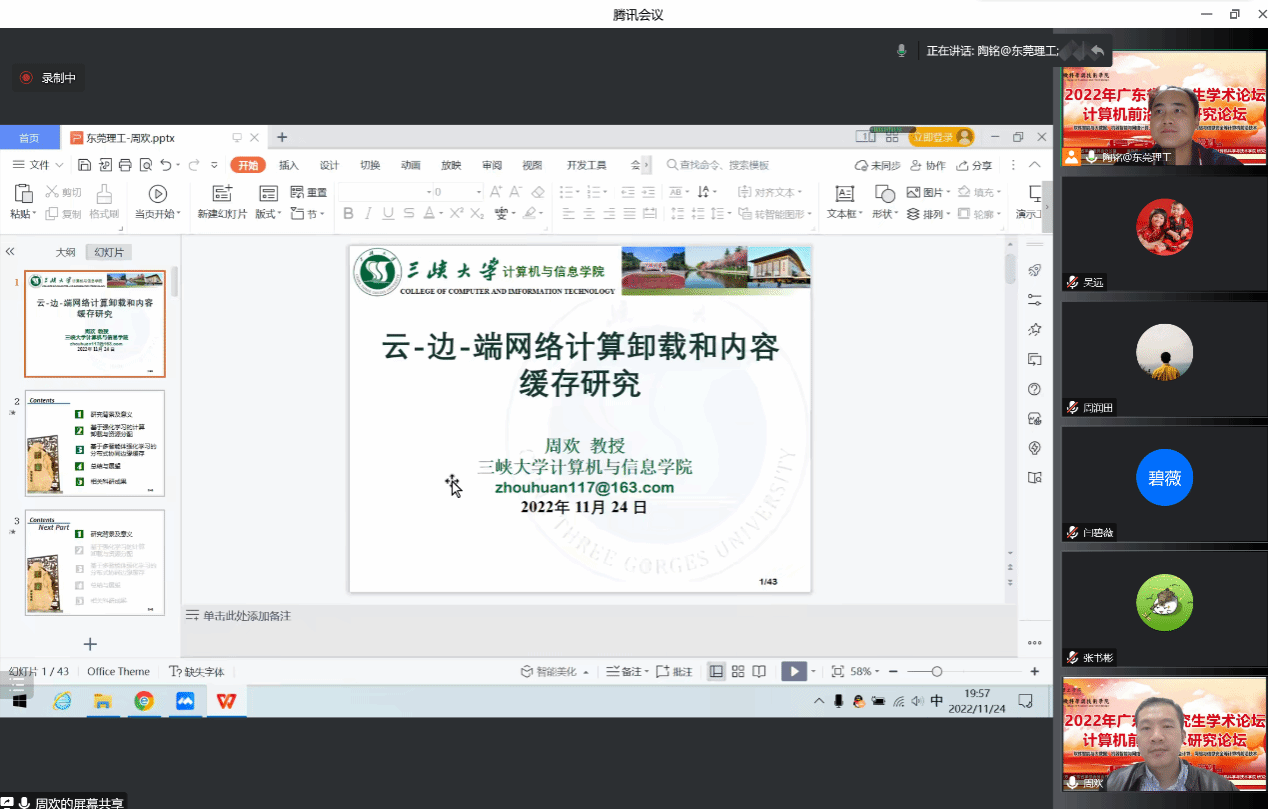 本次人工智能技术及应用分论坛很荣幸地邀请到了三峡大学计算机与信息学院教授周欢(湖北青年拔尖人才、湖北省“楚天学者”、大数据研究中心常务副主任)、澳门大学物联网与智慧城市国家重点实验室以及计算机与信息科学系副教授吴远(IEEE高级会员、IEEE通信分会Macau Chapter副主席)作精彩报告,sunbet申博,申博官网,sunbet官网副院长陶铭主持会议。受疫情影响,本次分论坛采用线上会议的形势开展,两场报告与会师生总数超200人。