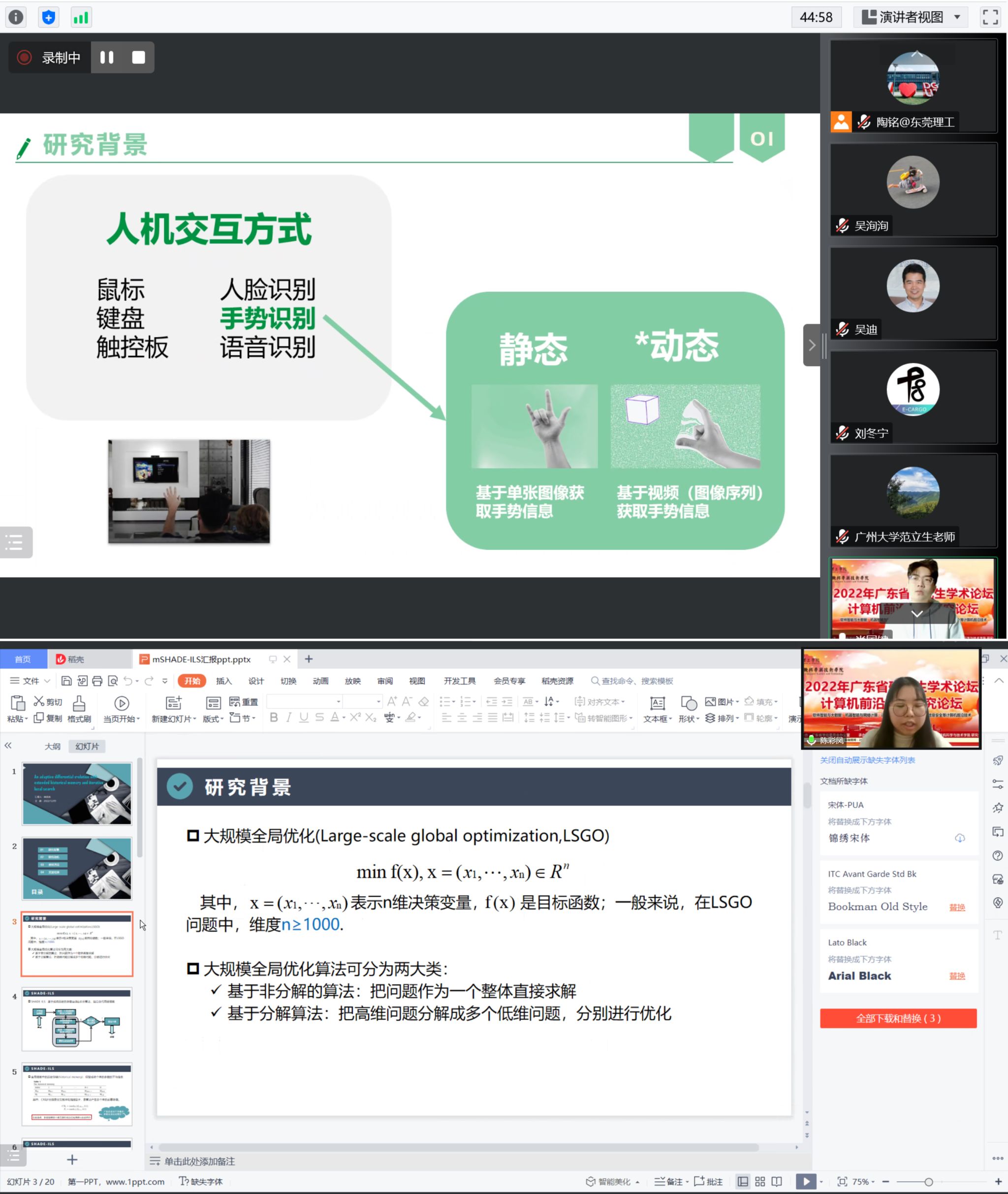 论坛征稿期间收到来自广东省内外双一流高校、高水平理工科大学研究生的大量投稿,经初步审核评选,共24篇进入最终的答辩报告环节。本次评选活动受疫情影响采用线上形式开展,共分为2组同时进行,每组邀请了5名高校专家担任评委。第一组受邀专家分别是暨南大学黄书强教授、华南师范大学郝天永教授、华南理工大学林伟伟教授、吉林大学李强教授、sunbet申博李蔚凌副教授;第二组受邀专家分别是中山大学吴迪教授、广东工业大学刘冬宁教授、广州大学范立生教授、北师港浸大UIC王田教授、sunbet申博陶铭教授。